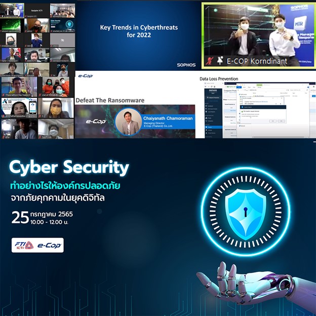 เมื่อวันที่ 25 กรกฎาคม 2565 สถาบัน ICTI, สภาอุตสาหกรรมแห่งประเทศไทย บริษัท อี-ซี.โอ.พี (ประเทศไทย) จำกัด (E-COP) ร่วมกันจัดกิจกรรมสัมมนาออนไลน์ฟรี ในหัวข้อ Cyber Security ทำอย่างไรให้ปลอดภัยจากภัยคุกคามในยุคดิจิทัล” ซึ่งผู้เข้าร่วมรับฟังจะได้ทำความรู้จักกับภัยคุกคามทางไซเบอร์ พร้อมแนวทางปฏิบัติ มาตรการควบคุม และกรอบการทำงานที่จะช่วยให้คุณสร้าง Cyber Security ได้อย่างมีประสิทธิภาพ ช่วยใหผู้ประกอบการได้รับความรู้ความเข้าใจ ลดความเสี่ยงและป้องกันความเสียหายอันจะเกิดขึ้นจากภัยคุกคามทางไซเบอร์ พร้อมรับฟังการแนะนำโซลูชั่นและการให้บริการด้าน Cyber Security ระดับประเทศ