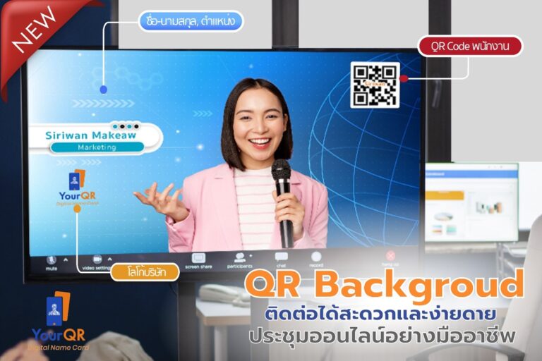 QR Background ช่วยให้การประชุมออนไลน์ของท่านเป็นไปอย่างมืออาชีพ รองรับทุกแอปพลิเคชั่น ผู้เข้าร่วมประชุมก็จะสามารถสแกน QR Code บน Background จะแสดงผลเป็นนามบัตดิจิทัลของพนักงานคนนั้นๆ ทันที เป็นอีกช่องทางหนึ่งในการแชร์นามบัตรออนไลน์