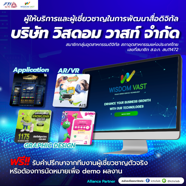 WISDOM VAST CO.,LTD. ก่อตั้งเมื่อวันที่ 1 พฤษภาคม 2551 ด้วยทุนจดทะเบียน 10,000,000 บาท เป็นบริษัทไอที มีประสบการณ์ในการพัฒนาสื่อดิจิทัลให้กับหน่วยงานภาครัฐและเอกชนชั้นนำของประเทศอย่างต่อเนื่อง อาทิ หน่วยงานในสังกัดกระทรวงต่างๆ ผู้ให้บริการเครือข่ายโทรศัพท์ ผู้ให้บริการความบันเทิง รวมถึงผู้ผลิตสมาร์ททีวี สมาร์ทโฟน ฯลฯ มีประสบการณ์และมีความเชี่ยวชาญในธุรกิจด้านนวัตกรรมและเทคโนโลยีให้บริการด้านเนื้อหาในรูปแบบดิจิทัล Application และ e-Auction รวมถึงเทคโนโลยี Augmented Reality, Virtual Reality และ Motion Detection