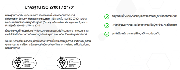นอกจากนี้ บริษัทฯ ยังได้รับการรับรองมาตรฐาน ISO / IEC 27001: 2013 ซึ่งเป็นมาตรฐานความปลอดภัยของข้อมูล ซึ่งแสดงให้เห็นว่าบริษัทมีมาตรฐานอยู่ในระดับสากล ในการให้บริการลูกค้าอย่างมีประสิทธิภาพ