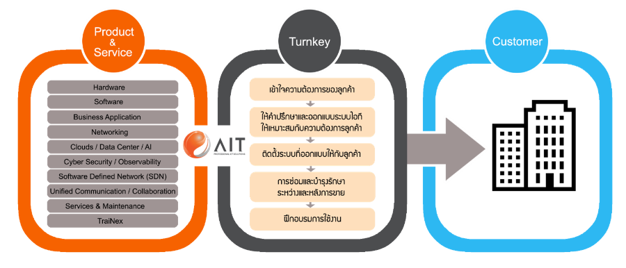 AIT ให้บริการโซลูชันและบริการด้านเทคโนโลยีสารสนเทศและการสื่อสารที่หลากหลาย ครอบคลุมทั้งการออกแบบ ติดตั้ง และบำรุงรักษาระบบต่าง ๆ ดังนี้:
