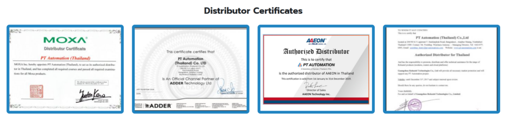 PT Automation (Thailand) Co., Ltd. เป็นตัวแทนจำหน่ายอุปกรณ์ด้าน Industrial Internet of Things (IIoT) จากหลากหลายแบรนด์ชั้นนำระดับโลก และได้รับการแต่งตั้งให้เป็นตัวแทนจำหน่ายอย่างเป็นทางการในประเทศไทย ประกอบไปด้วย แบรนด์ Adder, AAEON, Getac, Moxa, และ Robustel