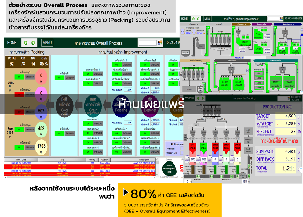 ซึ่งจากการดำเนินงานโครงการของบริษัท มหานครไรซ์ จำกัด ร่วมกับทีมผู้เชี่ยวชาญได้มีการนำเสนอโซลูชั่นและแผนงานในการติดตั้งระบบ SCADA ใน 2 ส่วน คือ ส่วนที่ 1 : Machine Monitoring ในกระบวนการปรับปรุงคุณภาพข้าว (Improvement) และกระบวนการบรรจุข้าว (Packing) และส่วนที่ 2 การวัดค่าประสิทธิภาพการผลิตของเครื่องจักร (OEE) แบบ Real-Time เพื่อการวัดประสิทธิภาพการทำงานของเครื่องจักร นำไปสู่การทำ Process Improvement ช่วยให้ผู้บริหารมีข้อมูลในการตัดสินใจในธุรกิจให้มีประสิทธิภาพมากขึ้น