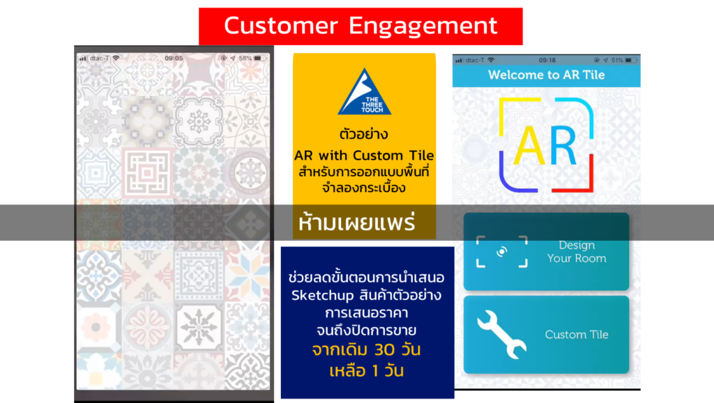 บริษัท เดอะตรีทัช กรุ๊ป จำกัด ผู้ประกอบการ SMEs ผู้ผลิตและจำหน่าย รับปูกระเบื้องปูพื้น, กระเบื้องสระว่ายน้ำ, กระเบื้องดินเผา, กระเบื้องเคนไซ, กระเบื้องลายโบราณ ซึ่งบริษัทฯ ประกอบธุรกิจให้บริการและติดตั้งกระเบื้องปูพื้นแบบ Customize ซึ่งในกระบวนการนำเสนอขายแก่ลูกค้าต้องมีต้นทุนในการออกแบบกระเบื้องตัวอย่าง ด้วยวิธีการสร้างขนาดกระเบื้องเสมือนจริง (SketchUp) เพื่อช่วยให้ลูกค้าสามารถเห็นภาพเสมือนจริงและตัดสินใจซื้อได้ง่ายขึ้น ซึ่งจากเดิมมีต้นทุนการ Sketchup สินค้าตัวอย่างเฉลี่ย 40 ชิ้นงานต่อออเดอร์ และยังใช้เวลานานกว่าจะปิดการขายได้ ทำให้เสียโอกาสทางการค้าไปมากขึ้น