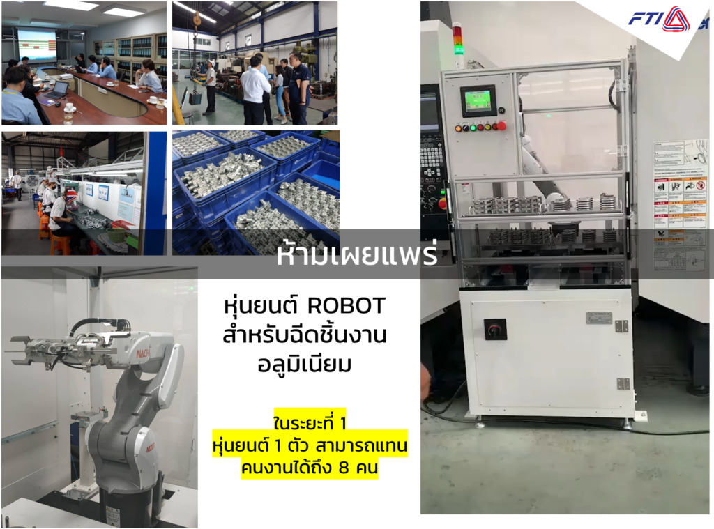 ซึ่งภายหลังจากการดำเนินงานโครงการ และได้ติดตามผลมาสักระยะหนึ่ง พบว่า สามารถลดต้นทุนแรงงานได้ทันที ซึ่งจากการทำ Prototype การใช้งาน Robot ในจุดการอัดฉีดชิ้นงานอลูมิเนียม จำนวน 1 ตัว สามารถแทนคนงานได้ถึง 8 คน ส่งผลให้สามารถเพิ่มประสิทธิภาพการทำงานของฝ่ายผลิตเพิ่มขึ้นกว่า 80% จากอัตราเดิม และก่อให้เกิดประสิทธิภาพในการบริหารจัดการคำสั่งซื้อของลูกค้าได้มากขึ้น จากเดิมมูลค่างานค้างส่งในระบบเฉลี่ย 1,200,000 บาทต่อเดือน คงเหลือ 340,000 บาท ในเดือนแรก และมีแนวโน้มจะลดลงมากขึ้นเรื่อยๆ
