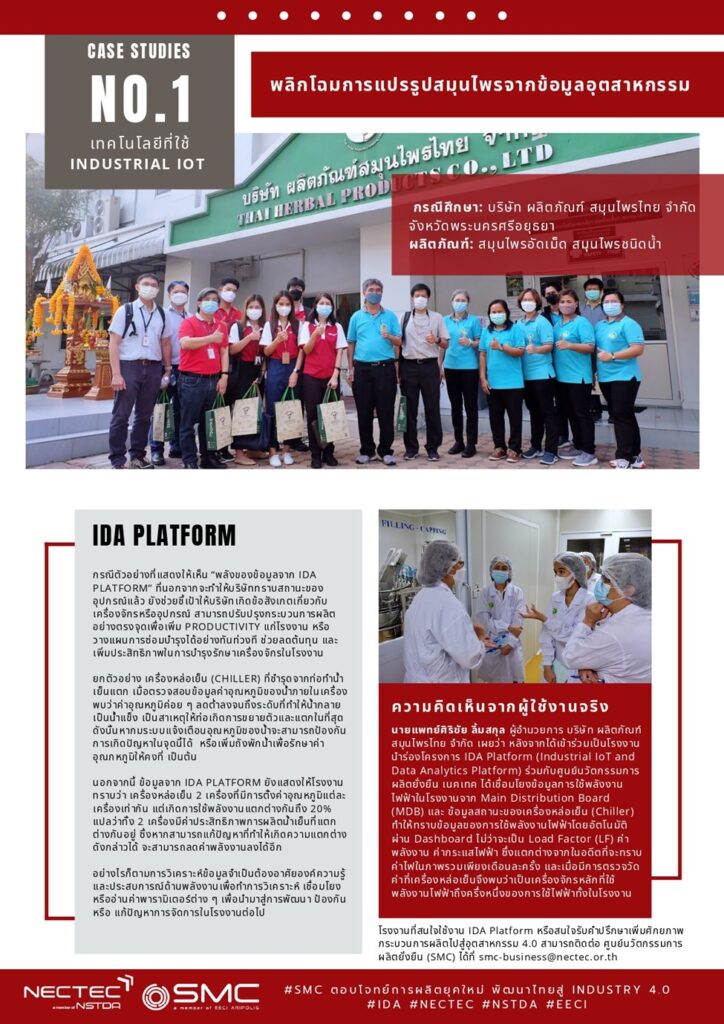 นายแพทย์ศิริชัย ลิ้มสกุล ผู้อํานวยการ บริษัท ผลิตภัณฑ์สมุนไพรไทย จำกัด เปิดเผยว่า “หลังจากที่บริษัทฯ ได้เข้าร่วมเป็นโรงงานนําร่องโครงการ IDA Platform (Industrial IoT and Data Analytics Platform) ร่วมกับศูนย์นวัตกรรมการผลิตยั่งยืน (SMC) NECTEC ซึ่งได้ทำการติดตั้งอุปกรณ์และเชื่อมโยงข้อมูลการใช้พลังงานไฟฟ้าในโรงงานจาก Main Distribution Board (MDB) และข้อมูลสถานะการทำงานของเครื่องหล่อเย็น (Chiller) ทําให้บริษัทฯ สามารถทราบข้อมูลของการใช้พลังงานไฟฟ้าโดยอัตโนมัติ ผ่าน Dashboard ไม่ว่าจะเป็น Load Factor (LF) ค่าพลังงาน รวมทั้ง ค่ากระแสไฟฟ้า ซึ่งแตกต่างจากในอดีตที่จะทราบค่าการใช้ไฟฟ้าในภาพรวมเพียงเดือนละ 1 ครั้งเท่านั้น และเมื่อมีการตรวจวัดค่าที่เครื่องหล่อเย็น จึงพบว่าเป็นเครื่องจักรหลักที่มีการใช้พลังงานไฟฟ้าถึงครึ่งหนึ่งของการใช้ไฟฟ้าทั้งโรงงาน ซึ่งข้อมูลที่ได้จาะ IDA platform เหล่านี้ ทำให้บริษัทฯ สามารถบริหารจัดการการใช้พลังงานให้มีประสิทธิภาพมากขึ้นในอนาคต”